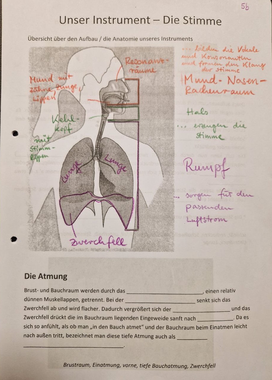 Arbeitsblatt: beim Singen beteiligte Körperteile